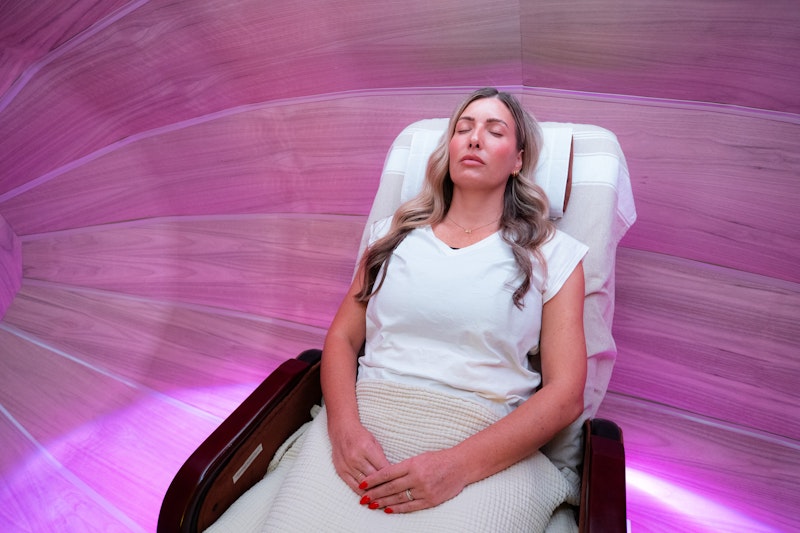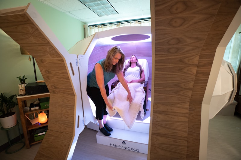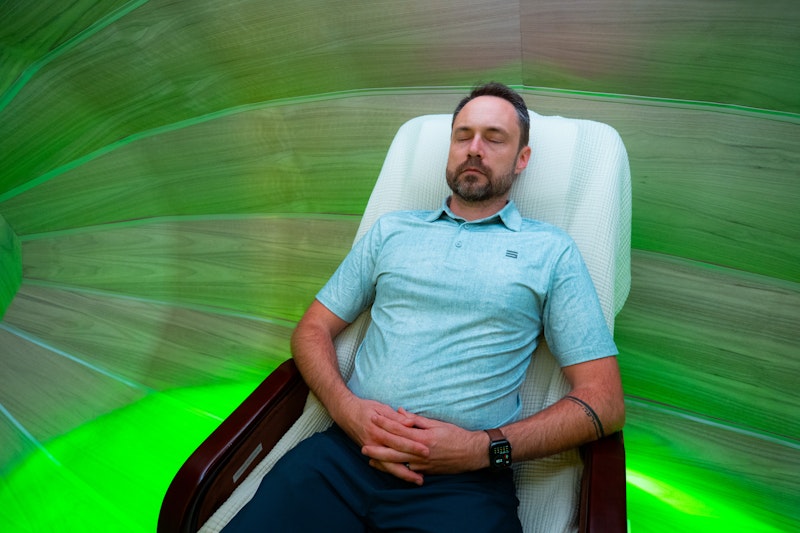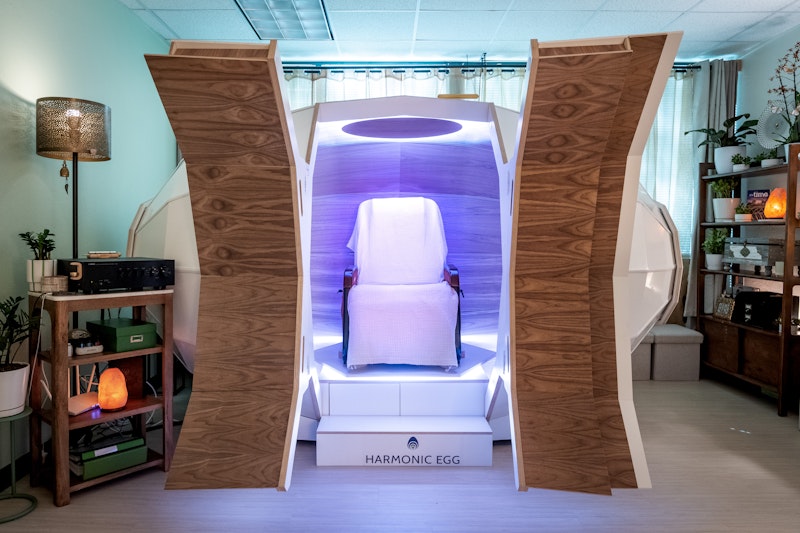 Reclined in a zero-gravity chair, you may drift in and out of thought, meditation, or sleep. You might experience sensations of weightlessness or wave-like movement as sound and light frequencies envelop you.